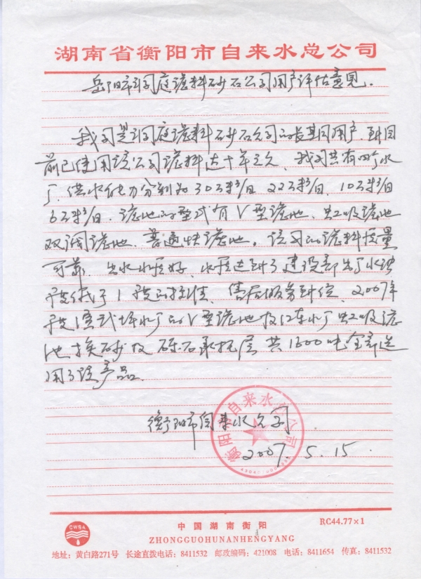岳阳市洞庭滤料砂石有限公司 DONGTING LAKE IN YUEYANG CITY, SAND FILTER LTD.