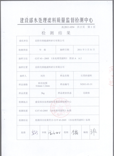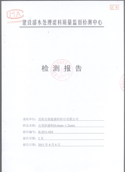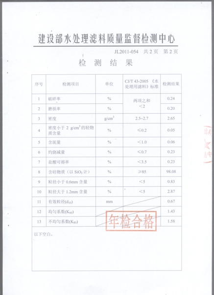 石英砂滤料(0.6mm~1.2mm)检测报告