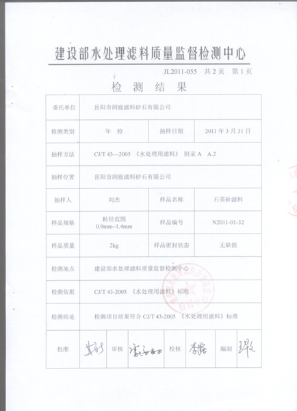 石英砂滤料(0.9mm~1.4mm)检测报告